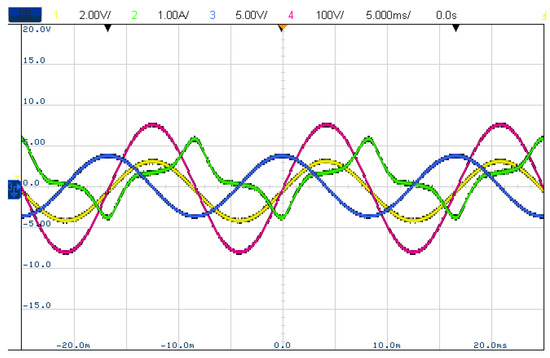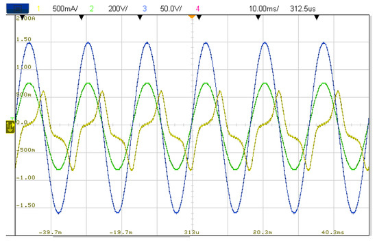 A screenshot from the oscilloscope is shown in Figure 6. The current of the low-voltage side i1 is illustrated as Channel 1 (yellow), the voltage of the high-voltage side v2 is illustrated as Channel 2 (green), and the low-voltage side is illustrated as Channel 3 (blue). The voltages on the primary and secondary sides of the transformer were 109.49 and 220.54 V, respectively, which accord with the nominal voltage of the equipment. The no-load current on the primary side was 365.83 mA, and the no-load loss was calculated as 40.05 W.