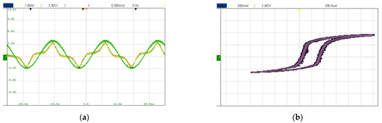 As shown in Figure 4b, when the oscilloscope’s XY mode (Lissajous pattern) was used, an equal-ratio B–H curve was obtained. Specifically, the x- and y-axes were set as the current of the primary side and the output voltage of the integrating circuit, respectively. Additionally, the channel of the output voltage of the integrating circuit was inverted to have the same polarity as that of the input signal. The oscilloscope cannot be used to multiply the primary-side current and the output voltage of the integrator circuit by and as in Equations (3) and (4). Therefore, these coefficients were used only as references for relevant comparisons. As indicated by the DC offset, both the x- and y-axes shifted on the B–H curve.