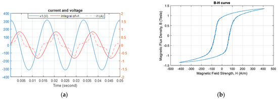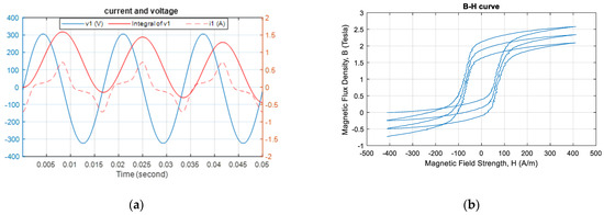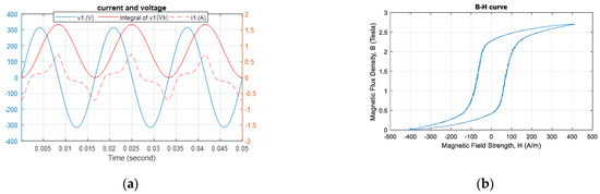 Figure 11a shows the voltage integration process (Step 5) starting at 90° within the voltage phase. The DC components were filtered out through subtraction of the mean value. Thus, the two aforementioned integration problems did not occur. Figure 11b shows that the B–H curve (plotted in Step 6) was symmetrical in both the x- and y-directions, which resulted from the factoring out of data-processing errors.