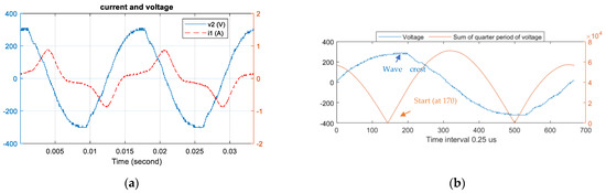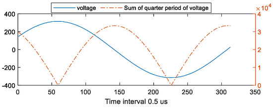 The dominant frequency calculated from the analysis of the voltage waveform in Figure 7 (Step 2) was 60 Hz, which accorded with the nominal specifications of the power supply. Figure 10 shows the value derived in Step 4 from the voltage waveform through a half-cycle frame (represented by a dotted line). The position corresponding to the lowest point of the sum was the peak of voltage and the initial position of integration.