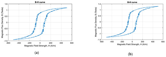 As shown in Figure 4a, the output signal of the integrator (integrated voltage) was reversed from that of the oscilloscope setting because of the polarity inversion of the integrator. The two signals of the primary current and integration of secondary voltage had a minor DC offset, which may have affected the B–H plot.