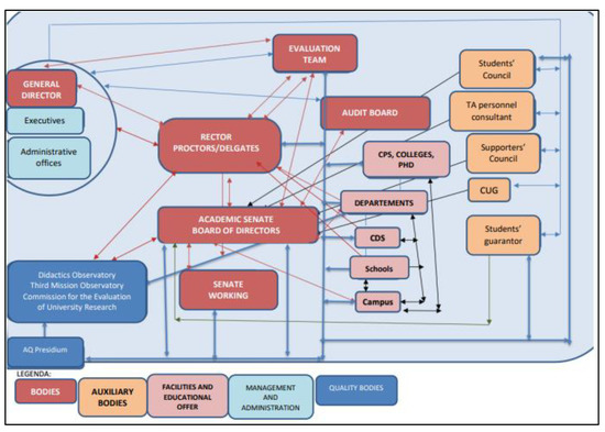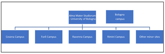 This community-oriented approach remained alive through the centuries and currently University of Bologna is developed on several campuses located in Bologna, Cesena, Forlì, Ravenna, and Rimini. The university is organized into 5 schools, 32 departments (of which, however, only 17 are grouped into the 5 schools), and 232 study courses covering 16 subject areas. It includes centers and libraries and offers study facilities indicated in the Social Responsibility Report [33]. A general overview of University of Bologna has been reported in Figure 1.