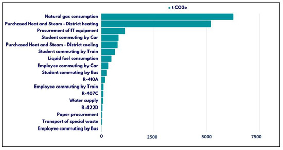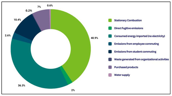 Since carbon footprint calculation acts as a baseline for evaluation and future mitigation efforts, several universities developed specific studies. A study at Clemson University quantified each greenhouse gas emission source and discussed the data assumptions and life cycle phases included to improve carbon footprint comparison with other higher education institutions. The results showed that Clemson University’s carbon footprint for 2014 was approximately 95,000 metric tons CO2e and 4.4 metric tons CO2e per student. The largest sources of greenhouse gas emissions were estimated in electricity generation (41%), automotive commuting (18%), and steam generation (16%). Electricity generation from coal was 29% of the electricity generation resource mix and accounted for three-quarters of Clemson University’s GHG emissions associated with electricity [24]. An interesting methodology to estimate an average student’s personal carbon footprint has been developed at a university in Shanghai, through an online survey aimed to capture students’ energy consumption patterns, behavioral tendencies, and willingness to engage in energy conservation. Survey responses, combined with utility data and emissions calculations, indicated that the average annual carbon footprint was a relatively modest 3.84 tons of CO2 equivalent per student, with 65% attributable to daily life, 20% to transportation, and 15% to academic activities such as studying. The top three individual uses were dining (34%), showering (18%), and dorm electricity loads (14%) [25].