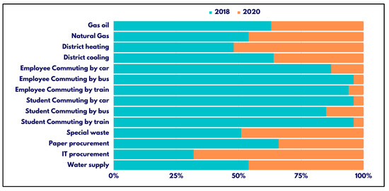 Another significant and novel issue is related to the application of the methodology to the data concerning two very different years (2018 and 2020). Indeed, during the year of the COVID-19 outbreak, there was no longer the possibility to travel freely to the university as well as to be together daily in the same locations. This resulted, for instance, in a strong decrease in paper purchases because most activities were moved online, in a lower consumption of gas oil because the need to heat the classrooms had decreased, and in a reduction in impacts from home—university traveling by the university community related to the remote connection. Without considering direct emissions, which were calculated only for 2020, the only sub activity that significantly caused higher emissions in 2020 than in 2018 concerned the purchase of IT equipment, which increased due to smart working. It can therefore be concluded that district heating activities and the use of natural gas show little difference when an anomalous year, characterized by the pandemic, is compared to an ordinary year. This means that they are certainly activities in which the university can directly act to make improvements and decrease its consumption and emissions.