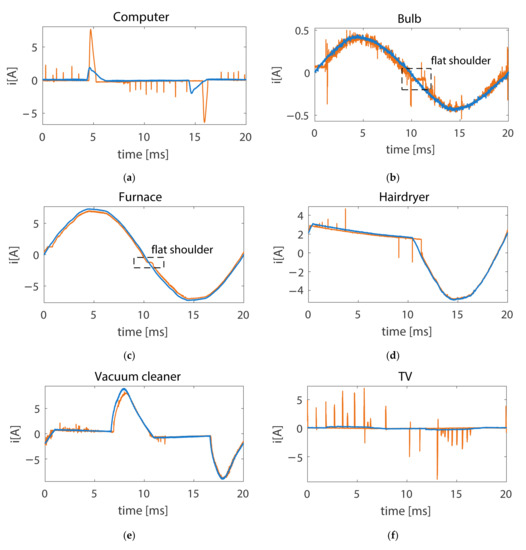 Current waveform for individually operating appliances with (orange line) or without (blue line) presence of series arc fault. (a) computer, (b) bulb with marked flat shoulder effect, (c) furnace with marked flat shoulder effect, (d) hairdryer, (e) vacuum cleaner, (f) TV.