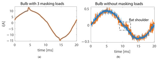 The ZCP feature was efficient mostly for individually operating appliances. In the case of a larger number of devices operating simultaneously (where only a part is powered through an arc fault), the flat shoulder effect was reduced (Figure 6). There were current waveforms for the same two periods—one with the presence of an arc fault (orange line) and another without an arc fault (blue line). In Figure 6a, the analyzed signal was , including current signals suppressed by masking loads. The increase of ZCP in the case of an arc fault occurrence was minimal here. In Figure 6b, the analyzed signal was , which was sub-metered only for load 2 (bulb). There was an almost fourfold increase in the value of ZCP when an arc fault occurred.