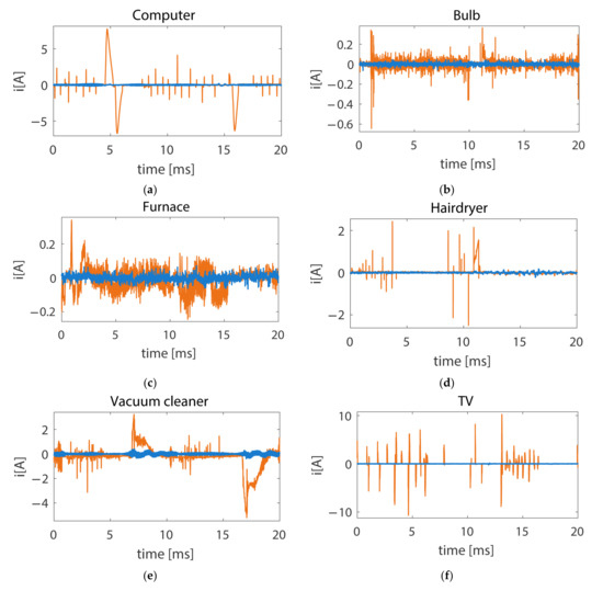 Changes between adjacent cycles of current signal for individually operating appliances with (orange line) or without (blue line) presence of series arc fault. (a) computer, (b) bulb, (c) furnace, (d) hairdryer, (e) vacuum cleaner, (f) TV.