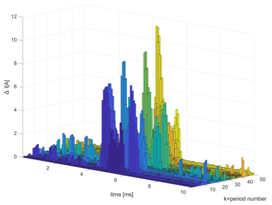 Differences between adjacent periods were varying. For the current signal the sum of absolute values of differences between the adjacent vectors during an arc fault had a repeatable character. We proposed the algorithm for calculating feature vector, allowing for the identification of the device powered via the arc fault line (arc fault location section on Figure 2). Then analyzing the topology of the electrical network and knowing the line powering the device enables locating an arc fault (line selection). Examples of absolute values of differences between 50 consecutive periods are shown in Figure 9. The figure shows only the first half of the periods for better readability. It can be noted that the changes in the current signal occurred only in part of the periods k and had varying values.