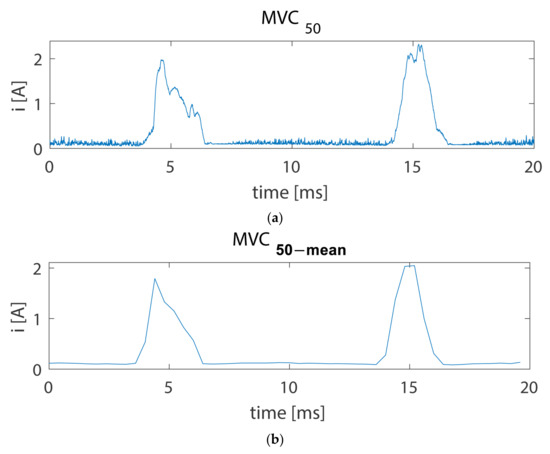 For reducing the number of attributes in vector from 5000 (the number of samples in one cycle) to 50, the mean for every 100 values was calculated, resulting in the vector. Figure 10 shows (Figure 10a) and (Figure 10b) vectors, calculated based on the data shown in Figure 9.