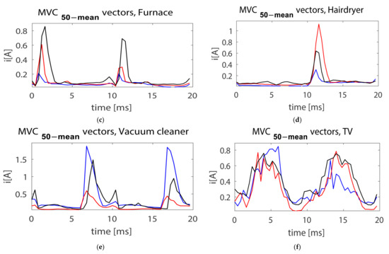 Examples of vectors for the occurrence of series arc on-line with particular tested appliances for a different number of devices operating simultaneously (blue line—one device, red line—two devices, black line—three devices) (a) computer, (b) bulb, (c) furnace, (d) hairdryer (e) vacuum cleaner, (f) tv.