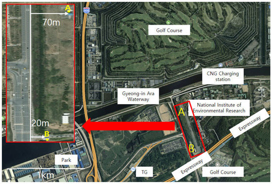 The aerial image of the sampling site for investigating the emission characteristics of TRWP according to the roadside separation distance (http://map.naver.com (accessed on 20 July 2022)).
