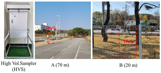 The aerial image of the sampling site for investigating the emission characteristics of TRWP according to roadside separation distance is presented in Figure 1. Total suspended particles (TSP) were sampled with high-volume samplers at two points, 20 m (region B) and 70 m (region A) away from the roadside (see Figure 2). The vehicles usually driving near region A were heavy-duty vehicles and various construction machinery, owing to the industry complex and construction site around region A. On the other hand, region B, placed around the road interaction, included various vehicles from small-size passenger vehicles to heavy-duty vehicles. The average velocity of vehicles in region A was around 22 ± 5 km/h, due to the speed limit zone of 30 km/h. The average speed of vehicles in B was from 22 km/h to 45 km/h. The TSP samples were collected three times at 24 h intervals. During the collection, the average wind speed, temperature, and precipitation were recorded as 1.1 m/s, 24.2 °C, and 0.1 mm, respectively. For the pre-treatment of the quartz fiber filter with the working temperature that ranged from ambient to 700 °C, impurities were removed through 5 h heat treatment at 600 °C. The filter was then stored in a chamber with constant temperature and humidity, and was weighed using an analytical balance. The filter paper on which samples were collected was stored under the same conditions.