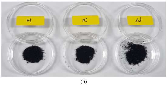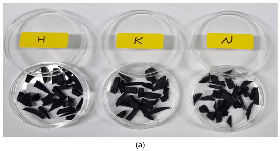 The bulk tire samples were cut from the tread of tires in vehicles passing through point A and point B of the road, and then very small particle samples made from the bulk samples, as presented in Figure 3. Based on the liquid nitrogen cooling method, the bulk sample cut from the tire tread was immersed in liquid nitrogen and pulverized to create fine samples [17,18,32]. The samples individually obtained from 16 different tires were tested and investigated. The width of tires used in this experiment ranged from 155 to 265 mm and the aspect ratio, which is defined as the cross-sectional height divided by the cross-sectional width and multiplied by 100, ranged from 40 to 80. The load index, which is defined as the weight the tire can support safely, ranged from 75 to 110. The tread depth of tires ranged from 1.02 to 7.75 mm. All the tires used in the experiment were all-season tires.