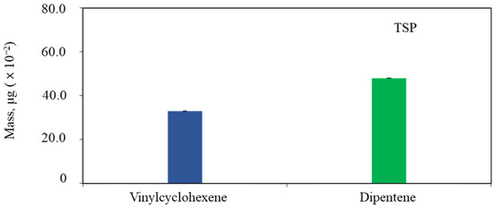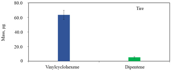 The distribution of vinylcyclohexene and dipentene measured in the TSP sample is depicted in Figure 5. This figure exhibits the higher value in mass for dipentene, 0.48 μg, compared to that for vinylcyclohexene, 0.33 μg. This is different from the tendency in the experiment results for the tire samples (shown in Figure 4). In general, SBR has complex structures with bridges, crosslinks, and network structures. In contrast, NR has a general linear structure. Thus, NR appears to wear from tires in the form of lighter particles than SBR [34]. Therefore, it can be concluded that more dipentene, a marker of NR, was detected in the high-volume sample than vinylcyclohexene, a marker of SBR. As described earlier, the mass trend of vinylcyclohexene and dipentene in the air is similar to the previous study [6], indicating that the mass of SBR and BR is lower than that of NR.