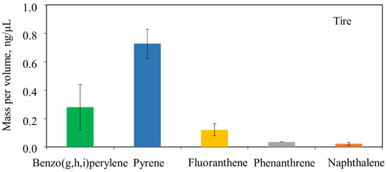 The distribution of benzo(g,h,i)perylene, pyrene, fluoranthene, phenanthrene, and naphthalene of PAHs measured from the tire samples were represented in Figure 6. The highest concentration of pyrene was exhibited, followed by benzo(g,h,i)perylene, fluoranthene, phenanthrene, and naphthalene in that order. This result can be attributed to the aromatic oil being chemically added to the tire manufacturing process [10,11,17,18,36].