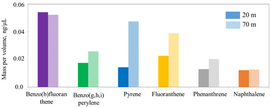 For the 70 m (comb-pattern bar), the mass per volume for benzo(b)fluoranthene noticeably shows higher (0.053 ng/μL) than that for the other chemical components consisting of PAHs in TSP, 0.028 ng/μL for benzo(g,h,i)perylene, 0.048 ng/μL for pyrene, 0.039 ng/μL for fluoranthene, 0.019 ng/μL for phenanthrene, and 0.01 ng/μL for naphthalene, which can be attributed to the incomplete combustion of fossil fuels and tire wear particles. Furthermore, the mass per volume for benzo(g,h,i)peryline, pyrene, fluoranthene, and phenanthrene in the 70 m TSP samples were relatively higher than those of 20 m, as depicted in Figure 7. This can be, as stated earlier, due to the heavy-duty vehicles used in the industrial complex for cargo transport and various construction machinery in the construction sites, which were placed near the TSP sampling equipment. In general, the environmental condition in which the heavy-duty vehicles drive and construction machinery operate would lead to higher PAHs emissions, which can cause to higher chemical components consisting of PAHs.