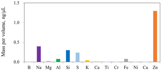 The distribution of metal components in the tire samples was represented in Figure 8. The metal components in the environment are mainly induced by the additives for fuel and lubricant oil and non-exhaust emissions (i.e., metals used in the tire and brake). Because the metals also are very significant components affecting human health and the environment [4,12,13,28,29,30,31], the investigation was comprehensively carried out in this study. As shown in this figure, Zn exhibited the highest concentration among the heavy metals, followed by Na, Si, Al, Mg, Fe, S, and K, in that order. The accelerators used in the vulcanization process include Pb, Mg, Zn, sulfur and calcium oxides. The retardants include terpene-resin acid blends. Zn is added by 1% in tire manufacturing [39]. It has also been reported that Zn in tires exists as inorganic matter (ZnS and ZnO) and organic compounds (Zn stearate), and accounts for 0.4–4.3% of tire treads [13,28,39]. Therefore, the concentration of Zn appears to be high [12,14,17,18].