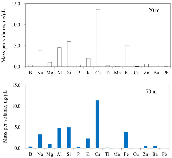 Figure 9 represents the distribution of metal components in TSP samples at 20 m and 70 m. Ca exhibited the highest concentration among the heavy metals in TSP, followed by Si, Fe, Al, Na, K, Mg, and Zn. This was similar to the result of a previous study in which Ca, Ma, Na, K, Fe, and Al showed high values in the heavy metal analysis results at a roadside measurement point [12]. In particular, Ca, Ma, and K are metal components that occur at high proportions in soil matrices and are reported to be the influence of resuspended dust in soil [12]. In previous studies on the distribution of metals for road dust and vehicle exhaust gas, Al, Fe, and Ca were observed in both road dust and vehicle exhaust gas, but Si, Cu, and Zn were mainly measured in road dust and S, Na, and Mg in the exhaust gas from vehicles [28,40,41]. From the previous studies, it is revealed that heavy metals in the atmosphere are affected by road dust, tire wear particles, and vehicle exhaust gas.