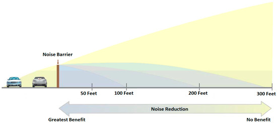 Figure 1 shows the noise barrier effectiveness, which reduces noise levels by 10–15 dB [24], cutting the loudness of traffic noise in half [20,25,26].