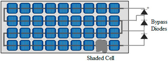 Connecting solar cells in series means that a shaded or damaged cell begins to act as a load, thus eliminating the effect of the entire series [38]. The power consumed in the cell can also turn into heat, and in some cases, damage the facility [39]. If the module containing the defective cell is also connected in series with other modules, this may also lead to a limitation of the current flow. One method to reduce this type of loss and avoid damage is to connect bypass diodes across one or a number of cells [37,40]. Thus, the current bypasses existing shaded or damaged modules or cells.