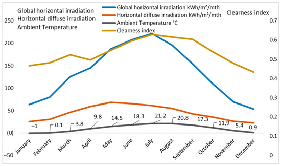 Solar radiation is different around the country depending on weather conditions, direction, different types of days, and latitude. For the case study, the Kaman district (Central Turkey; Location: 39°20′52.8″ North, 33°44′42.7″ East, Elevation: 1127 m) in Turkey is chosen. Figure 4 shows the monthly average solar radiation, ambient temperature, and clearness index data in the Kaman district. It can be noticed that the monthly average solar radiation ranges from 53 to 221 kWh/m2/month, while the annual average of solar radiation is 134.2 kWh/m2/month. The clearness index ranges from 0.43 to 0.63, while the average daily clearness index is 0.54.