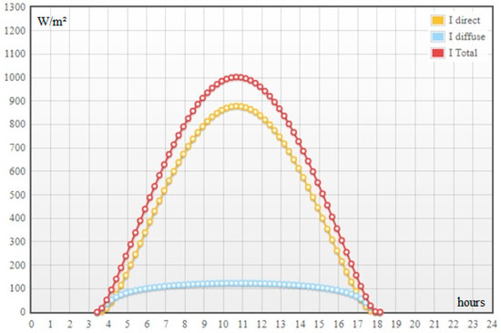 Direct radiation is radiation with a fixed direction, coming directly from the center of the Sun and reaching the Earth’s surface, without any dispersion in the atmosphere. Diffuse radiation is a type of radiation that is somewhat diffused (reflected) until it reaches the Earth’s surface. Diffuse radiation waves that undergo only forward reflection can be considered in the same category as direct radiation. Figure 5 shows solar radiation types for Kaman city on 1 June. Table 2 summarizes direct, diffuse radiation at 32°.