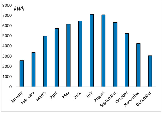 The total expected generation for the facility in shadow-free conditions is 64,551.64 kWh per year. The month with the highest generation is July when a total of 7415 kWh of generation is realized as shown in Figure 7. Less than 4.1% of the total generation takes place in January, as seen in Figure 7. Losses due to azimuth angle are less than 0.02%.