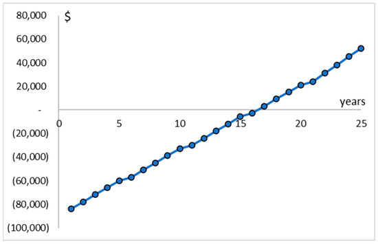 There are several financial instruments with varying areas of use for evaluating an investment. The feasibility evaluation model mainly includes the net present value (NPV), and levelized cost of electricity (LCOE). When assessing the profitability of investments, the NPV method is usually used. It is the value reached as a result of discounting the return of investment during the investment period with market interest and discounting it to the present. When calculating the time value of money, the rate of return that the business expects from the investment is taken into account. If the net result is negative, the investment project should not be implemented, if the result is non-negative, its implementation should be considered. The discount occurs using an NPV factor according to the below Equation (1). The NPV is calculated by Formula (1):