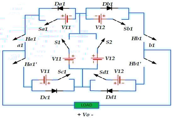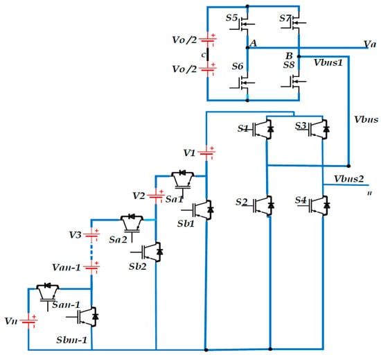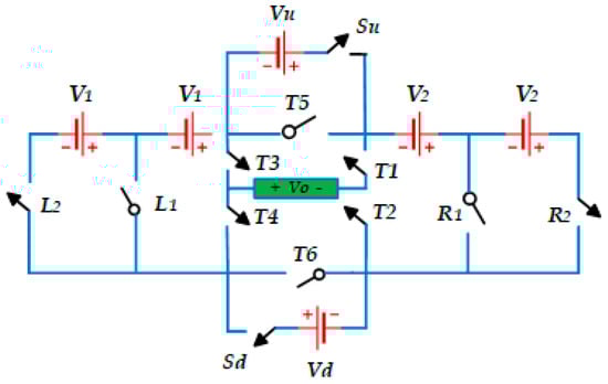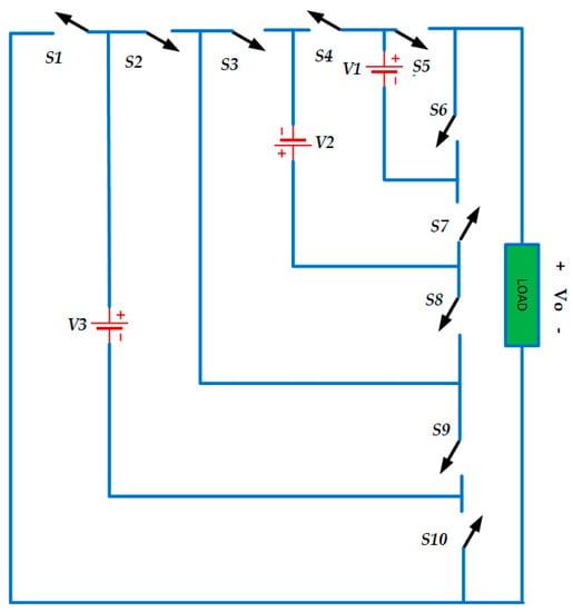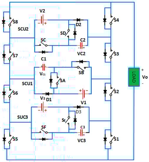 - Alishah, R.S.; Hosseini, S.H.; Babaei, E.; Sabahi, M. A New General Multilevel Converter Topology Based on Cascaded Connection of Submultilevel Units with Reduced Switching Components, DC Sources, and Blocked Voltage by Switches. IEEE Trans. Ind. Electron. 2016, 63, 7157–7164. [Google Scholar] [CrossRef]