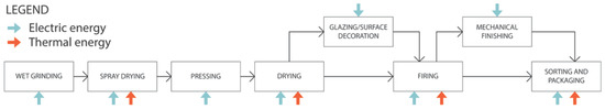 The production process of ceramic tiles begins with the storage and preparation of raw materials. This phase consists of two main operations: grinding and water content adjustment [37]. Grinding generally takes place through a wet process to obtain an aqueous suspension (named “slip”), with a typical water content of 30%. The water content adjustment uses a spray-drying technology that allows an immediate heat exchange between a hot air flow and the slip, which is transformed into a spherical granulate, called atomized, having shape and moisture content (5–6%) suitable for the subsequent pressing phase [38]. After compacting the atomized product through a continuous or discontinuous pressing phase, the unfired or “green” tile is dried to eliminate the residual water through a process of surface evaporation and interstitial diffusion. The subsequent phases can include the glazing and surface decoration of the tiles. The ceramic products are subsequently fired in kilns until they reach the maximum temperature around 1000–1200 °C, then, they are quickly cooled. For some product types (such as “majolica” or “cottoforte”), the firing takes place according to two distinct heat treatments: the first consists of the firing of the ceramic support or “biscuit”; the second of firing the glaze and any surface decoration. After cooling, tiles can be treated by several mechanical finishing processes and then stored in deposits, after which, they are sorted and packed.