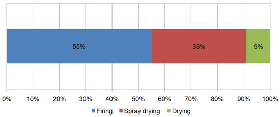 Approximately 70% of the total energy consumption, however, is due to the use of natural gas. Combustion of natural gas supplies the thermal energy necessary for the spray drying of the freshly formed tile bodies, as well as for the firing and packaging phases. Figure 2 shows the average percentage distribution of thermal energy consumption in the three main process phases. The highest energy consumption occurs in the firing phase, which accounts for 55% of all the thermal energy used, followed by the spray-drying phase (36%). Thermal energy used in the packaging phase generally does not exceed 1% of total consumption [39].