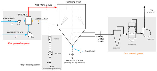 Figure 3 shows the layout of the spray dryer, the device used to remove moisture content from the slip. Slip particles are dried thanks to a hot stream (Section 5 in Figure 3) entering the top of the drying tower via a tangential peripheral aperture, at a temperature typically in the range 500–600 °C [13,38]. The characteristics of the generated vortex guarantee constant humidity and particle-size grading. Hot flue gases are generated inside a burner fed with natural gas (Section 3). The burner’s inlet air flows, taken from the ambient air, are divided in two streams: combustion air (Section 1), providing the oxygen content required for the reaction with natural gas in stoichiometric condition, and pressurized air (Section 2, also known as “dilution air”), required to lower the value of the combustion gases’ temperature. The presence of three fans allows for the maintenance of a constant negative pressure inside the tower. The burner-heated stream meets the slip, entering the bottom section of the tower (Section 6), finely sprayed upwards via nozzles in the form of droplets, and guarantees moisture evaporation by convection. Thanks to the heat exchange process, an immediate evaporation and consequent hardening of the external side of the droplet take place, and simultaneously, the water vapour in the interior leaves the droplet through its rear, which collapses inwards, forming the characteristic hollow sphere appearance. Spray-dried granules, still containing typically 5–6% of water, are discharged at the bottom of the spray dryer (atomized powder stream, Section 8).