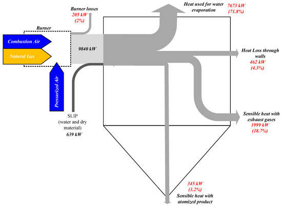 - The thermal energy used to preheat and evaporate the moisture content in the slip accounts for 72% of the total heat input to the spray dryer unit. Sensible heat with exhaust air and atomized powder account, respectively, for 19% and 3% of the input energy. The heat losses through the dryer walls reach 4% of the input energy.