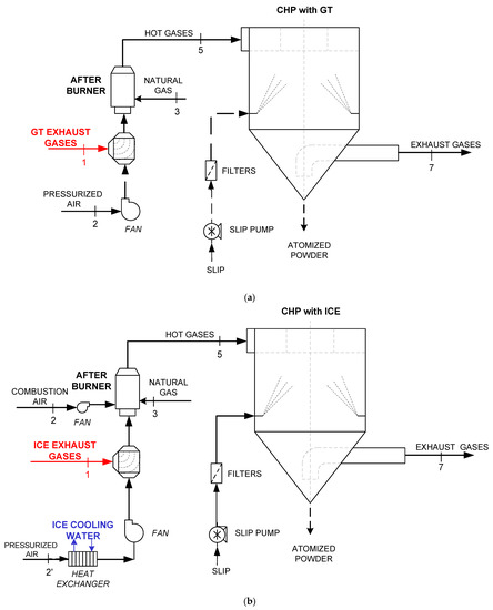 The most suitable thermal user for CHP application is the spray dryer, which is the component used to remove moisture content from the slip. CHP prime mover (PM) exhaust gases are directed to the drying process, thus suppling part of the heat required [13,16,17], with consequent natural gas savings. Commonly installed PMs are gas turbine (GT) or internal combustion engine (ICE) units [13].