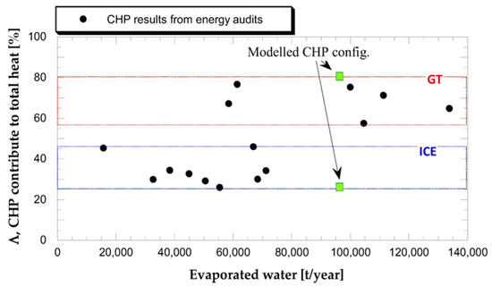 Percentage contribution of CHP thermal energy to total heat required by drying process as function of annual evaporated water. CHP results from energy audits [13].