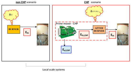 According to Figure 7, represents the specific emission of the i-th species, generated in the non-CHP scenario due to burner operation; refers to specific emission generated in the CHP scenario and accounting for emissions of the CHP unit and of the after-burner.