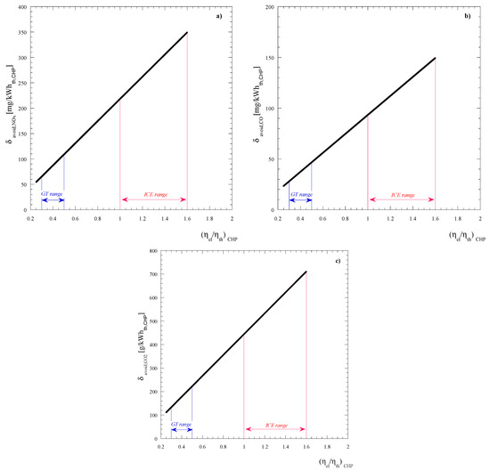 Avoided specific emission factor as function of CHP efficiencies ratio; (a) NOX, (b) CO, (c) CO2.