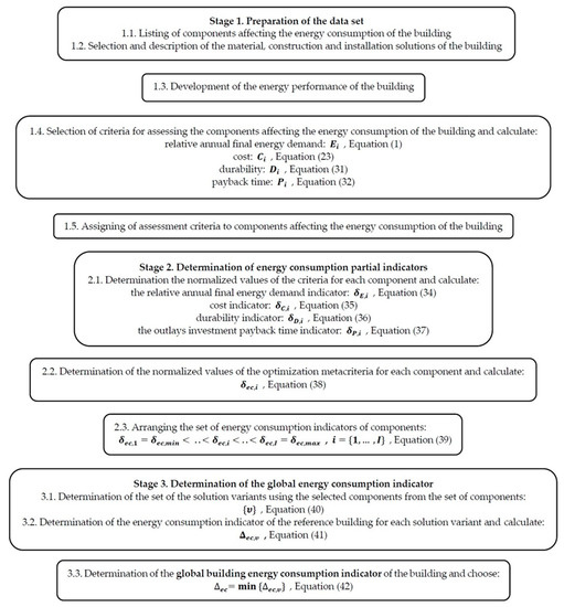The aim of this study is to develop a universal method for the unequivocal selection of the optimal combination of components determining the energy efficiency of buildings by means of an introduced global building energy consumption indicator. The basis of this method is a multi-criteria optimization of the components influencing the energy efficiency of buildings. The method requires the development of a detailed description of the set of components influencing the energy efficiency of buildings and the definition of the analysis criteria. The following analysis criteria were adopted: relative annual demand for final energy, cost, durability, and investment outlays payback time. The normalized values of these criteria are calculated in relation to the structure of a reference building. The proposed method makes it possible to explicitly indicate the most advantageous solution from the point of view of the weighted share of the individual criteria. The verification of the method was presented on the basis of the thermo modernization case study analysis for the adopted reference building. As a result, the most advantageous variant of modernization was determined, defined by the lowest value of the global building energy consumption indicator. A high effectiveness of the proposed method has been shown in relation to both the selection of the modernization option and the assessment of the individual component share in each modernization solution.