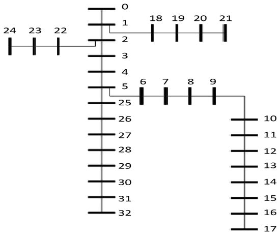 The 32-bus radial distribution system shown in Figure 2 and described in [] is considered in this study. The system peak demand was 4 MW, with a base voltage of 12.66 kV. The profiles of the system loads are from the IEEE Reliability Test System []. The house peak load was assumed to be 2.08 kW [] to calculate the number of houses at each bus, and it was also assumed that all loads were residential loads.