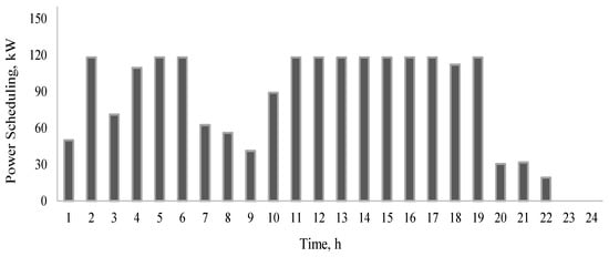 Using the proposed model, the power charging when swapping EV batteries was optimally scheduled to minimize the peak BSS load and provide the demand response for enhancing the distribution grid’s capacity. Figure 4 shows the optimal power scheduling of EV batteries for battery swapping, which varied from one hour to another based on the total number of EV batteries in stock, as well as the distribution grid’s operation constraints. It is to be noted that, in total, a minimum of 74 EV batteries were required to be in stock (30% of all PEV arrivals) for the system stability of the BSS and the avoidance of unserved EVs at the BSS. It was also observed that power charging of all EV batteries took place at all hours of the day, except for hours 23 and 24 because there are only 74 EV batteries in stock, and when they were already swapped, there was a need to charge the empty ones and make them available for battery swapping later during the day. It should be mentioned that when the number of EV batteries in stock was large enough, the power charging of EV batteries would take place only during the early period of the day, hence further reducing the peak system load.