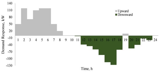 The scheduling of the BSS for demand response provisions was determined by using the proposed model, as shown in Figure 5. The downward demand response varied from one hour to another based on the number of EV arrivals in each hour for battery swapping instead of battery charging, and this took place in hours [11–18] and hours [20–23] in order to reduce the peak BSS load and, thereby, reduce the peak system load. However, an upward demand response occurred during the off-peak times—hours [1–8]—as a result of charging the EV batteries during the early hours of the day for the swapping of EV batteries during the later hours of the day at the BSS. It is to be noted that there were no differences between the EV charging and battery-swapping services during the idle states, such as in hours 9 and 10.