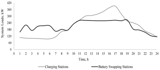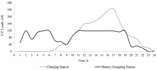 Figure 6 shows the EV load profiles of the BSS and the traditional EV charging station, and it can be observed that their load profile shapes were significantly different from each other. It is clear that the battery-swapping service helped reduces the peak station load and flatten the EV loads.