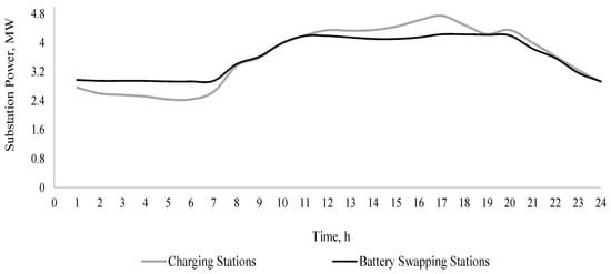 This section presents the effects of having multiple EV stations of different types serving the EVs on the distribution system’s loading (Figure 7), system capacity (Figure 8), and peak load (Figure 9). It was observed that the system load (Figure 7) and the power of the substation (Figure 8) in the case of the BSS were higher during off-peak hours, while they were lower during on-peak hours. In contrast, those of the EV station were higher during the on-peak hours and lower during the off-peak hours; hence, this impacted the distribution system’s operations and increased its peak load. The peak system load when the distribution system included charging stations was found to be 4.75, whereas having the BSSs in the distribution system reduced the peak system load (Figure 9) to about 4.22 MW. The power imported by the substation increased when including EV charging stations in the system, as shown in Figure 8. It can be concluded that the BSSs helped reduce the system’s load, the peak load, and the power imported by the distribution substation, thereby deferring the need for system upgrades.