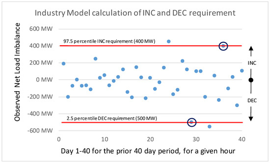 The Industry Model establishes an upper and lower INC and DEC requirement based on the 2.5th and the 97.5th percentile of the DV over the prior 40 weekdays, for a given hour and for weekends and holidays over the prior 20 day weekend/holidays [7]. The Industry Model INC and DEC predictions for a given hour are the same for all four 15 min increments within that hour.