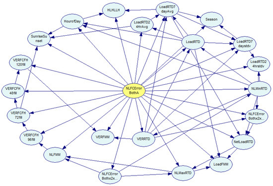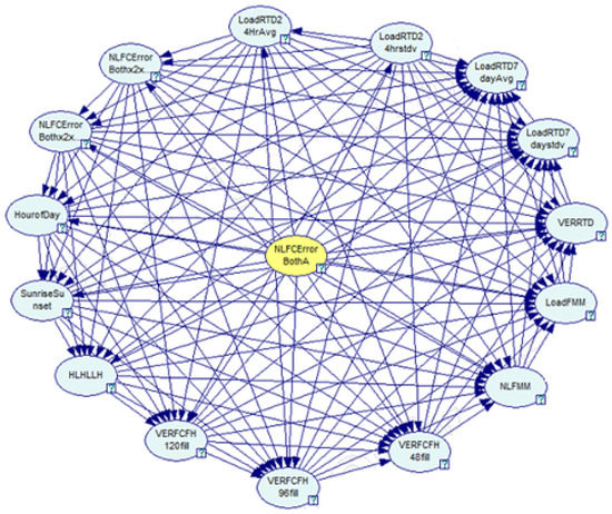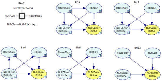 Four variables were chosen for the toy example: NLFCErrorBothA as the DV, HourofDay, HLH/LLH, NLFCErrorBothA2x1dayx as IVs. Figure 4 shows the RA specific graph G1 with these four variables and BN1, BN3, BN4, BN6 and BN12 described in prior work [28] and their corresponding network structures. All of these graphs have the same independence structure and thus, when data is applied, produce the same calculated conditional probability distributions and thus equivalent performance statistic results.