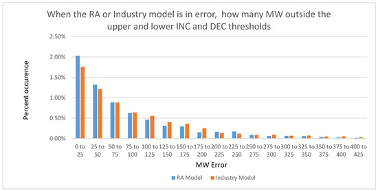 Metrics used to compare the RA INC and DEC prediction model to the Industry Model operationalize the general definitions published by the CAISO [9] and are: Average Requirement (the average INC and DEC requirement over all observations in the dataset), Coverage (a measure that is the inverse of error, where error is how many times actual imbalance is outside the INC and DEC requirement), Closeness (how close the actual imbalance is to the INC and DEC requirement, whether greater or less than these requirements), and Exceedance (when, more specifically, imbalance is greater than the INC or DEC requirement, how much does it exceed the INC or DEC requirement). These metrics are described in detail in the section titled “Metrics for comparing the INC and DEC prediction efficacy”.