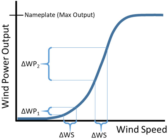 Similar to the Sunrise/Sunset variable, the 48 h wind forecast variable reflects times of energy imbalance uncertainty. Its information content is useful since knowing the wind forecast provides information about the maximum amount of INC that could be needed and maximum amount of DEC that could be needed. Additionally, the relationship between wind power output and wind speed shown in Figure 8 illustrates why the wind forecast is an important predictive variable. The greatest uncertainty in wind power output is when the wind forecast is in the middle of the nameplate (total possible output) of a plant. At low and high wind power output, the output changes little for small changes in wind speed, whereas at medium output, the output changes more significantly for the same small change in wind speed. Thus, actual wind power output is more variable when forecast output is around half of the plant nameplate. The RA Model is improved relative to the Industry Model by encompassing the wind forecast. The CAISO has been considering adjusting its methodology to account for the wind forecast, and the RA Model results and empirical results suggest that the predictive information contained in the wind forecast has the potential to significantly improve INC and DEC predictions.