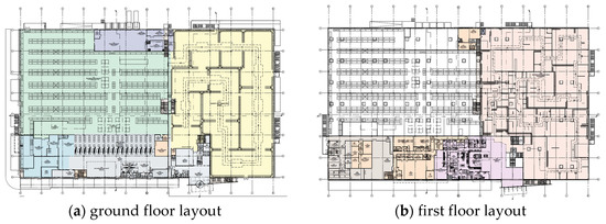 The examined facility is the IKEA Budaörs shopping center. This facility was built in 1999 and has a floor area of 12,400 m2. It is located in Budaörs in Hungary, in the vicinity of the capital (47.45404, 18.94016 m: 131 m). The building is constructed from a concrete frame with sandwich panel walls. The shopping center has two floors. The main areas on the ground floor are the market hall (see Figure 1a–yellow), the self-serve furniture area (see Figure 1a–green), and the check-out area (see Figure 1a–grey). The showroom sales area (see Figure 1b–peach), kitchen, and restaurant areas (see Figure 1b–purple), the workers’ restrooms and common area, offices (see Figure 1b–orange), and the building’s maintenance rooms are located on the first floor (see Figure 1b–brown). The first floor has a floor area of 7545 m2. The market hall and showroom areas have a maze-like design. Insufficient natural light reaches these areas; therefore, a significant amount of artificial light sources provide the appropriate amount of light. The people inside initiate a significant internal heat gain and fresh air demand, which must be dealt with by the building service systems. The areas most loaded by visitors are the market hall, showroom, restaurant area, and check-out area.