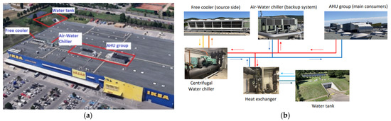 Buildings are responsible for a significant part of energy use in total energy consumption [1,2]. Recent dramatic changes in energy prices are expected to have a major impact on the way buildings are operated [3]. Total energy use in buildings increased by 8.4% over the last decade [4]; therefore, it is essential that we minimize this as much as possible as it represents a crucial task in the building sector [5]. The growth can be linked to climate change (longer cooling season) and the increase in comfort needs [6,7]. The European Parliament has a target to reduce energy consumption by 42.5% compared to 2007 levels [8]. An energy efficiency improvement of an existing building can be achieved by renovating the external building facade to reduce transmission losses through these structures [9,10,11]. Without renovation, one of the solutions for energy-saving purposes is if the building is integrated with renewable energies [12]. If none of the above-mentioned solutions can be applied, a different approach needs to be found to improve energy consumption. First, the building’s energy benchmarking is important [13]. Previous research has focused on using different methods and models to estimate the energy consumption of buildings [4,14,15,16,17,18,19]. One of these models for estimation is the use of energy simulation software, which calculates the heat loss and heat gain of a building with a given set of parameters, from which we can generate energy consumption. Another way of estimating consumption is the engineering method, where physical principles and empirical results are used. Several studies have used mathematical models to investigate heat loss and heat loads in buildings using polynomial regression and D-optimal design [14]. In the optimization process, algorithms were used to estimate the energy demand of a building as accurately as possible. With such a method, the estimation is highly dependent on the model parameters and the accuracy of the input data. In addition, the data-driven method can also be used, where the estimate is made by processing the actual consumption data of a building [16]. In this case, the estimation of future energy consumption can be predicted more accurately if there are no changes in the building’s operational needs and habits. The more annual energy consumption and meteorological data are gathered, the more accurately future energy consumption can be estimated. If the physical parameters of a building do not change, i.e., the building it is not upgraded, energy savings cannot be expected, unless an alternate building operating strategy is applied. In this article, a hybrid method is used and focuses on the summer cooling season, which investigates how to reduce the energy consumption of an existing building by changing the operating strategy of the systems used in the building. In summer, the cooling and ventilation systems consume the most energy in the building; therefore, optimizing the operation of cooling systems is important. Energy storage solutions are often used to separate production and consumption in time, allowing the cooling equipment to operate under more favorable operating conditions even at reduced loads. The impact of different cooling and storage methods are investigated using data from a real facility, to illustrate the differences in seasonal energy consumption. This study will focus on what prevents the use of stored energy in a real building, where the weak points of the system are, and what losses occur. The data and the mechanical system of the IKEA shopping center in Budaörs, Hungary were examined under different cooling modes. During the investigation, the hardware part of the mechanical system is not altered; only the automation control of the mechanical system is modified.