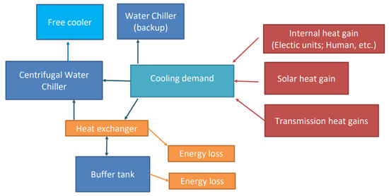 If the water chiller serves a system directly without cooling energy buffer storage, the instantaneous cooling demand of the facility will always determine the compressor capacity. If the hydraulic system includes a cooling buffer storage tank, that would allow the water chiller to operate under more optimal conditions, as the production and consumption of the cooling load can be separated in time. This study aims to develop an operating strategy that minimizes the energy consumption of the cooling system without modifying the mechanical system.